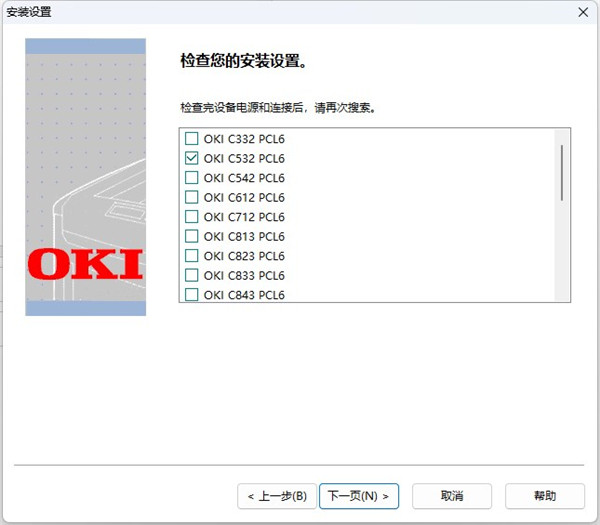 6、如点击“本地简易安装”,进入打印机界面选择,完成点击“OKI C532 PCL6”,完成点击下一步开始正式的安装