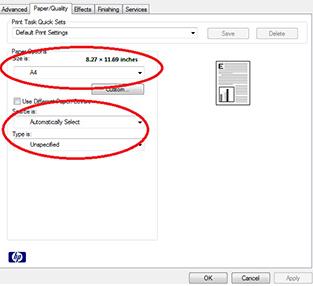 4、如果脱机配置页正常,建议打印驱动测试页看内容是否完整。如果驱动测试页内容不完整,建议重新安装驱动再试一下,可以尝试下载postscript的驱动安装测试,并查看一下驱动中纸张质量选项卡中的默认纸张尺寸,来源和自动选择的选项是否正确,以A4纸张为例。