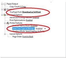 5、如果是电脑端打印office软件的内容不完整,建议可以尝试调节驱动设置试一下。在控制面板—打印机和传真,右键点击驱动图标,选择打印首选项,在高级选项卡中选择将Truetype字体下载为软字体,TrueType字体作为位图发送选择已启用。