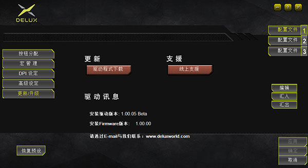 打开驱动设置界面(需连接设备,否则无法打开驱动),进行按键设置、宏设置、DPI设置、高级设置、更新升级设置等,可进行多组配置自定义。