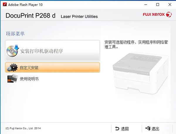 打印机驱动的安装十分的简单,用户仅需简单的几步即可完成相应的驱动安装,同时用户无需懂得过多的安装知识,全部默认安装即可。富士施乐P268d打印机是一款性能不错的激光打印机,打印负荷为10000页,支持有线网络打印,这样就方便了我们工作,能够轻松的打印。同时富士施乐P268d打印机外观为经典的黑白搭配,商务气息浓厚,最大支持A4幅面的纸张,内存容量为32mb,打印分辨率为600 x 600 dpi,首页输出纸张的时间为8.5秒,支持有线网络打印,大大的节省了办公的时间。支持USB2.0接口。