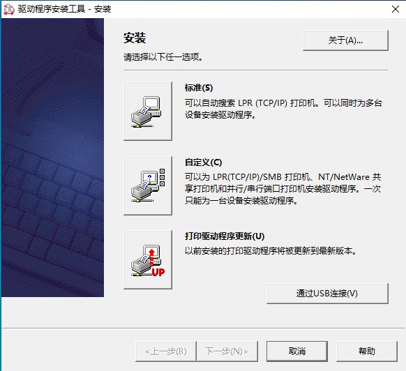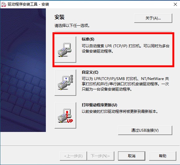 2、自动弹出安装界面,可点击“标准”由程序自动搜索LPR打印机,并可同时为多台设备安装驱动程序