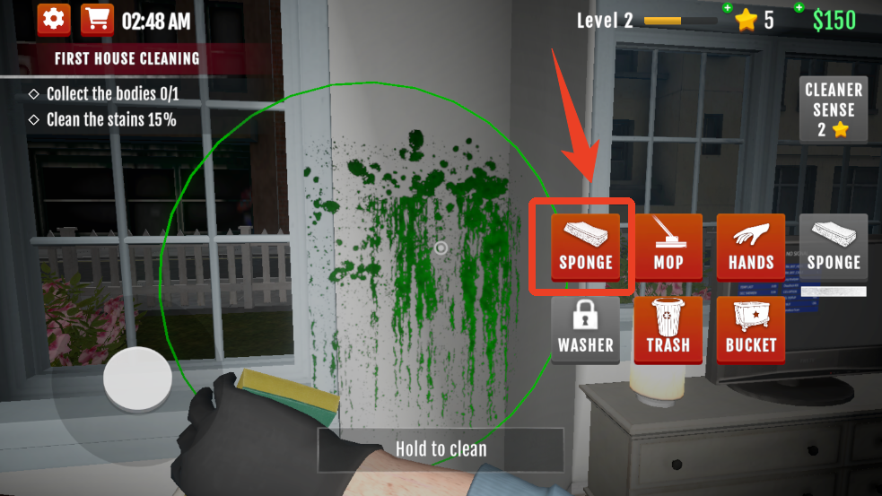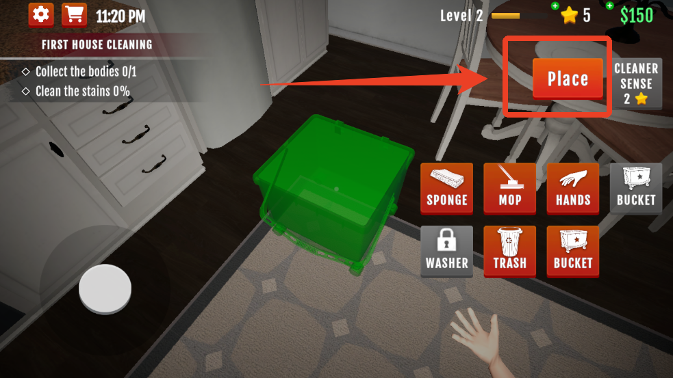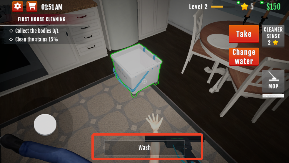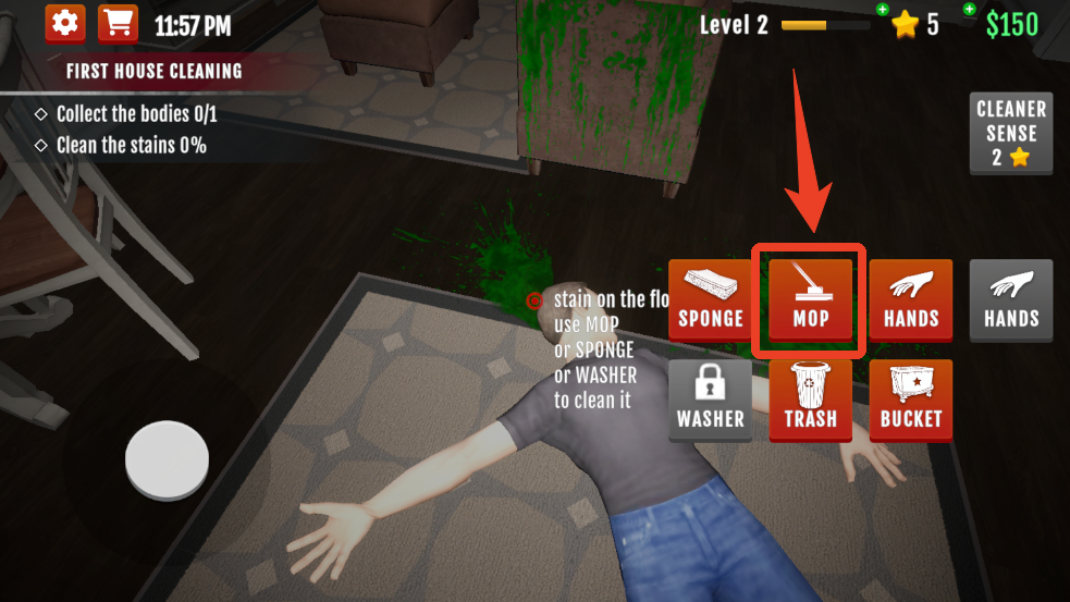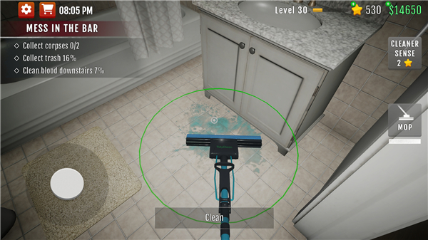 6、这时候我们点击【MOP】拿出拖把,将中间的光标对准地上的血迹出现圆圈时长按就能开始清理。