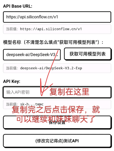 7、复制在下方密钥中之后点击保存,就可以继续和妹妹聊天了。