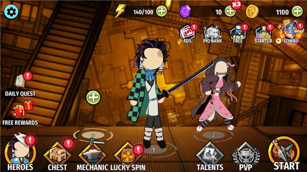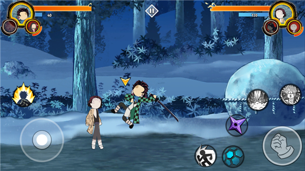 游戏玩法跟火柴人系列手游差不多,只不过是人物是鬼灭之刃人物及技能,不同的是玩家可以携带3个角色进入,可以自由切换它们,你可以灵活切换搭配技能释放连招,当双方谁全部人物死亡即获得胜利。在PvP战斗中匹配挑战全世界的朋友或其他玩家,看谁才是最强的stickman战士吧!