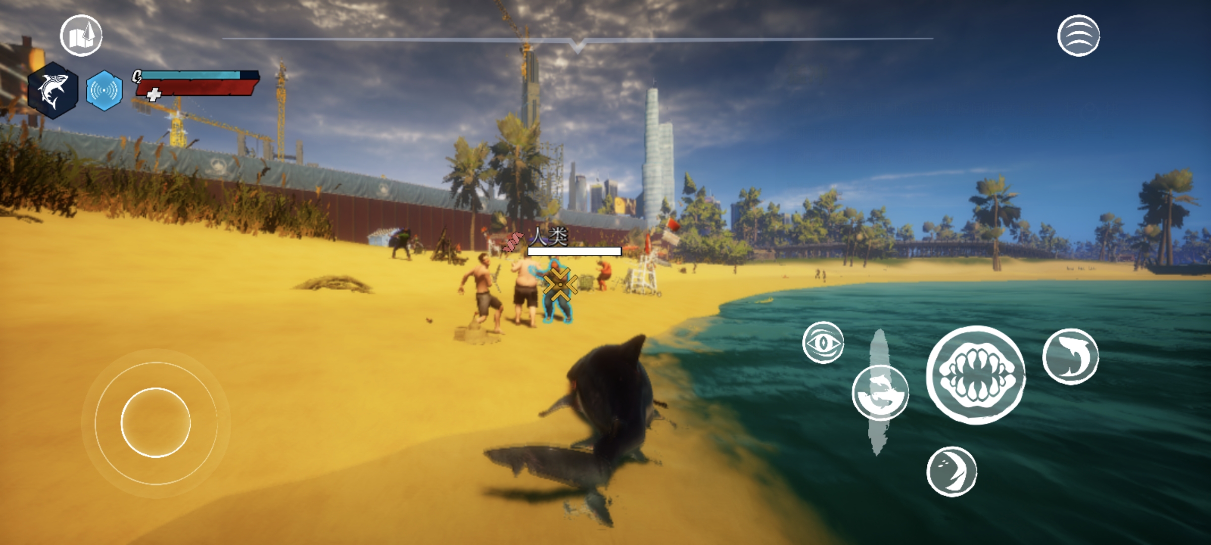 8、向上向下滑动“跃出水面”的按钮,可以控制鲨鱼游行的高度,浮出水面或潜入海底,在水面上使用时,可以触发跃出水面。这里有个需要注意的点,注意鱼鳃的脱水情况,在血条上方的进度条即将消失时,意味着鱼鳃即将脱水,需要立即从陆面返回水中。