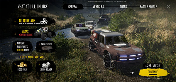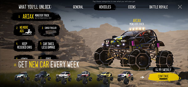 2、点击上方【VEHTCLES】可以看到很多炫酷的越野车,点击右下角【CONTINTUE】继续下一步。