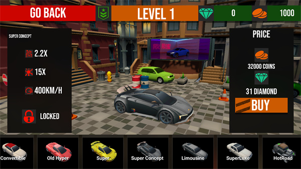 4、完成挑战后会获得许多游戏货币,然后玩家在这里可以用上你们的钻石和硬币了,可以改造喜欢的车,也可以购买车。