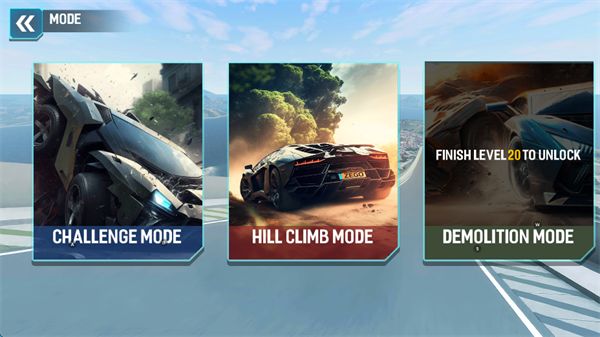 1、进入超级车祸模拟器游戏选择模式,挑战模式和爬坡模式,其余模式达到一定要求就可解锁。