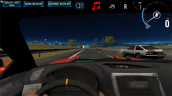2、屏幕左下方可以控制车辆的移动方向,屏幕右侧可以控制车辆的前进后退,手刹以及氮气加速,部分车辆氮气无限,屏幕上方从左至右,游戏画质,退出到游戏主页面,重新开始,车辆灯光(撞毁无法使用),音乐,游戏视角,以及重置车辆位置。