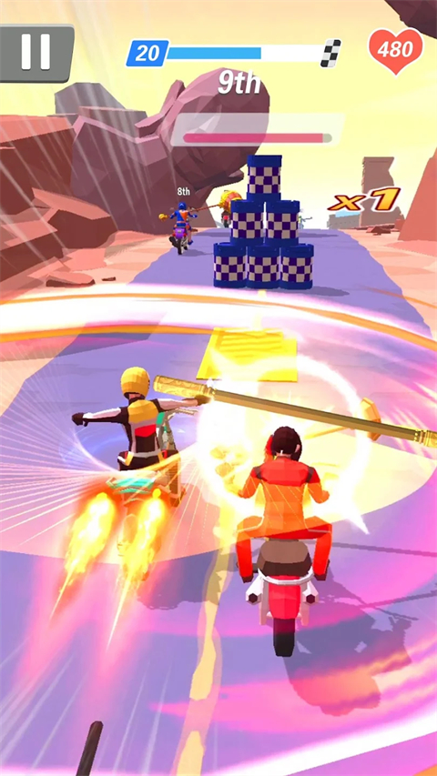 2、通过左右滑动控制摩托行驶方向,靠近其他赛车手,可以进行攻击,阻碍对方前行